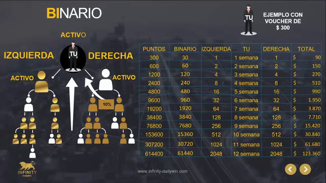En el plan de bono binario Infinity DailyWin nos paga el 10% de los puntos de nuestra pierna menor. En este bono tenemos dos piernas, que son la pierna derecha y la pierna izquierda. La pierna menor es la que tiene menos puntos. Un punto tiene un valor de $1 dólar. A medida que vas afiliando personas al sistema, estos se van agregando en tu pierna derecha y en tu pierna izquierda respectivamente, es decir que si traes un afiliado este será agregado en tu pierna derecha, pero el siguiente afiliado que traigas será agregado en tu pierna izquierda, y así sucesivamente mientras estés afiliando personas.