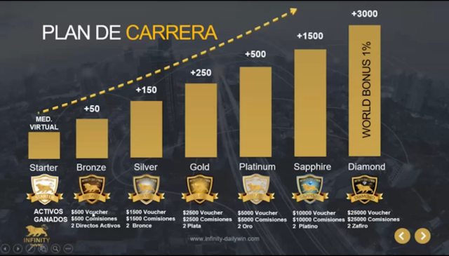 El plan de carrera de Infinity DailyWin es un conjunto de niveles que te van a permitir aumentar tus ganancias de manera exponencial dentro de la plataforma. Este plan consta de 7 niveles de profundidad, y tus ganancias dentro de la plataforma van depender del nivel en el cual te encuentres.